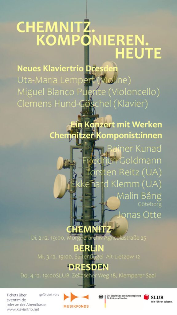 Nicht nur Leipzig, Dresden, Weimar und Berlin haben bedeutende Komponist:innen hervorgebracht, auch aus Chemnitz stammen wichtige Vertreter der älteren wie jüngeren Musikgeschichte. Aber gibt es eine spezielle Chemnitzer Schule? Eine Sprache, die die hier sozialisierten Komponist:innen eint? Dieser Frage geht das Konzertprogramm, das Klaviertrio-Werke Chemnitzer Komponist:innen aus den jüngst vergangenen Jahrzehnten vorstellt, nach und lädt ein, Gemeinsamkeiten und Unterschiede zu entdecken.